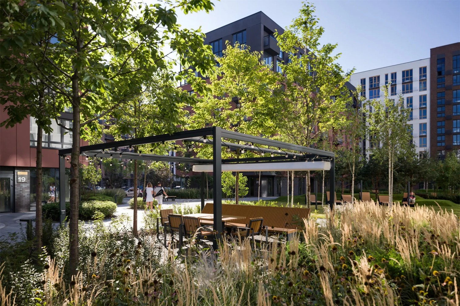 Guided by a respect for nature, this urban furniture project incorporates custom-designed benches, pergolas, and loungers to create semi-private community resting spaces. Litter bins, street lighting, and other supporting facilities are thoughtfully arranged throughout the area to enhance functionality and convenience.