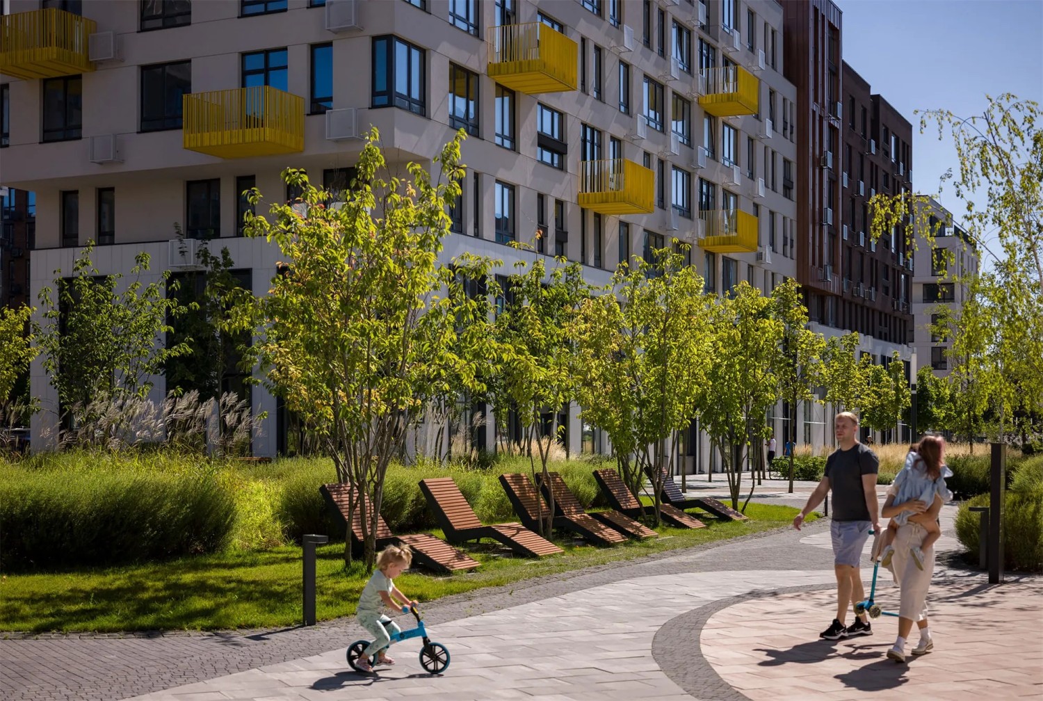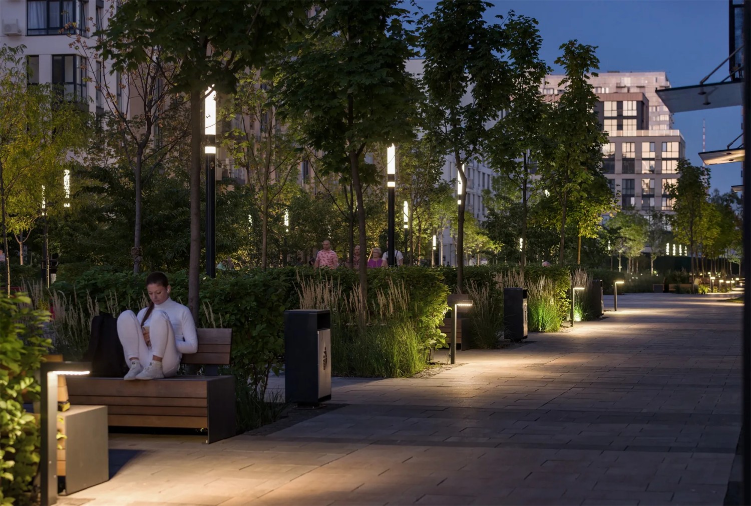 In addition, bollards finished in colors that match the surrounding building façades are installed in front of the residential blocks to restrict vehicle access and ensure safe pedestrian circulation.