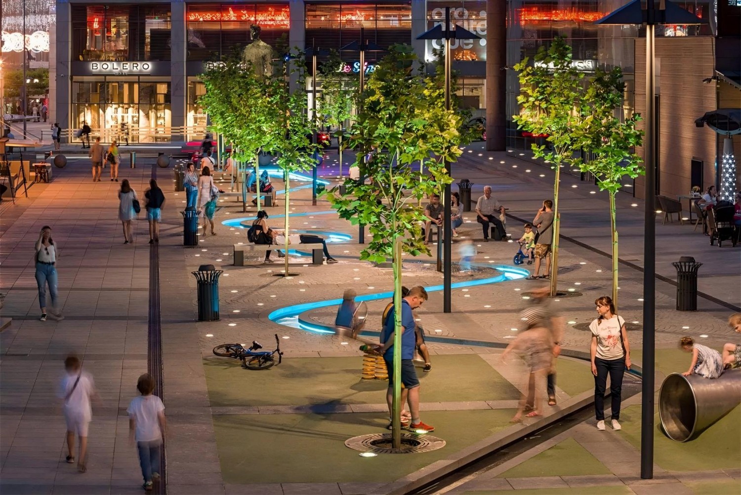 The central multifunctional zone is organized around benches as the core element. These are distributed across leisure and quiet seating areas to accommodate the resting needs of different user groups. At the same time, they help define safe activity boundaries for the children’s playground. With clean lines and a unified design language, the furniture minimizes visual intrusion and becomes an organic component of the space, reinforcing the pedestrian street’s overall coherence and contemporary character.